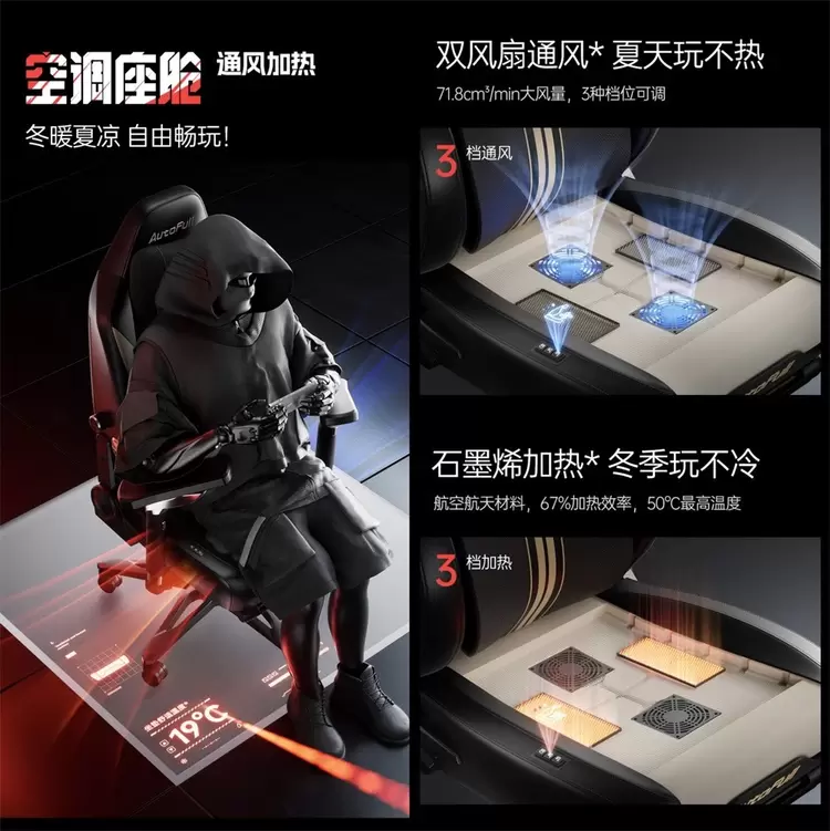 空调座舱将空调的控温功能创意性地引入电竞椅,通过加热和冷却元件实现温度控制。座椅内置双风扇,在最高档时可将座垫温度降低56%,按下通风按钮,每分钟可排出71.8平方厘米的空气流量,驱散长时间游戏的闷热不适。冬天也不用担心,坐垫内部采用航空航天材料——石墨烯,可将整体温度提高约67%,最高温度可达50°C。座垫内采用航空航天材料——石墨烯,能够将整体温度提高至约67%,最高可达50°C。按下加热按钮,石墨烯迅速发热,为您在寒冷的冬季提供舒适的温暖体验。