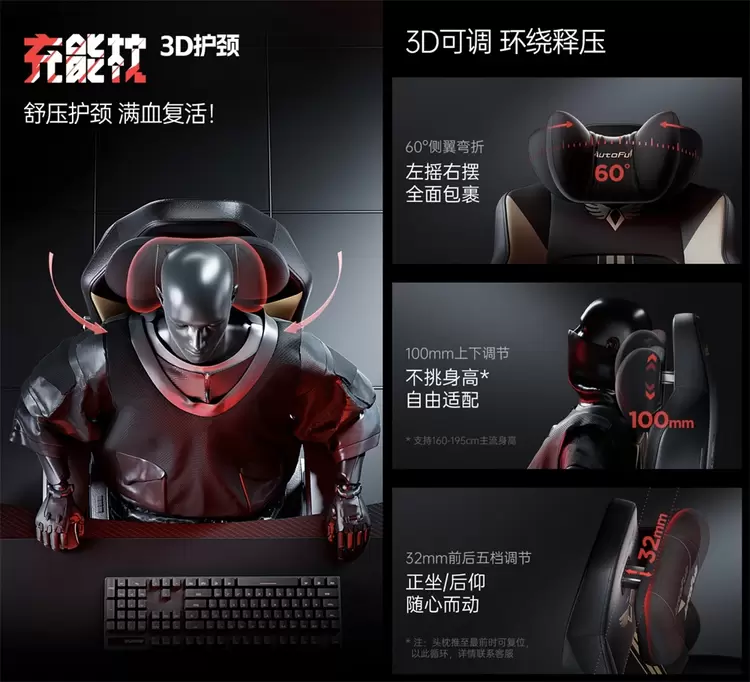 傲风M6 Pro+不仅在腰部支撑方面表现出色,其他配置也同样顶级。特别是针对“头枕只是装饰”的问题,M6 Pro搭载了行业首创的3D护颈充能枕。这个护颈枕不仅支持多维调节,包括100mm的上下调节和32cm的前后五档调节,用户可以轻松找到最舒适的位置。此外,60°的侧翼包裹设计为头颈提供了额外的舒适感和支撑。不论是在工作时长时间伏案还是在激烈的游戏过程中前倾,3D护颈充能枕都能灵活调节,确保颈部始终得到有效支撑。