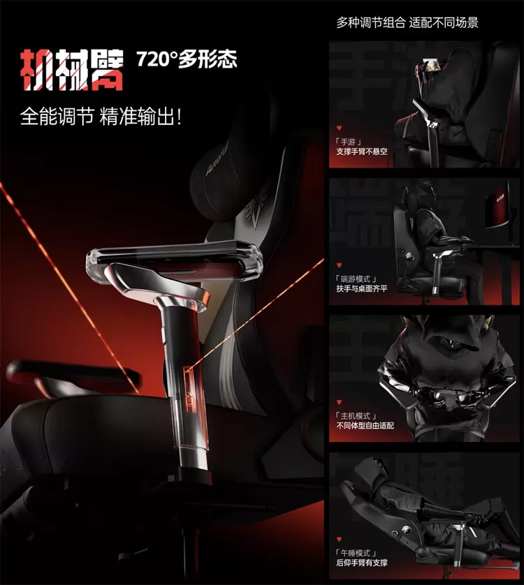 傲风6D机械臂,拥有上下、前后、内外、水平旋转、向上折叠,以及旋转折叠功能。而傲风M6 Pro+的机械臂在此基础上再次进化,扶手面可以360°旋转,再加上360°扶手柄旋转,使用更灵活,支撑更稳定!无论是正坐端游、主机Switch、还是休闲手游,手臂和肩膀都能得到支撑,久玩不累手,电竞更酣畅!此外,午休模式时,可以将扶手180°旋转,后仰模式下手臂仍然有支撑。