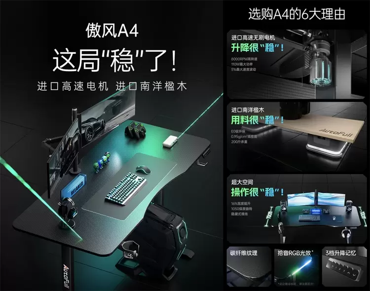 此外,同期上线的傲风A4电竞桌同样表现出色。针对传统电竞桌的四大痛点——劣质电机升降时晃动、劣质板材甲醛超标、桌面空间狭小影响操作、桌面电线凌乱——傲风A4提出了创新的解决方案。它采用进口高速无刷电机和+FOC矢量控制器,提供精准控制,8000RPM高转速,110W最大功率,25mm/s快升降,升降很"稳"!。