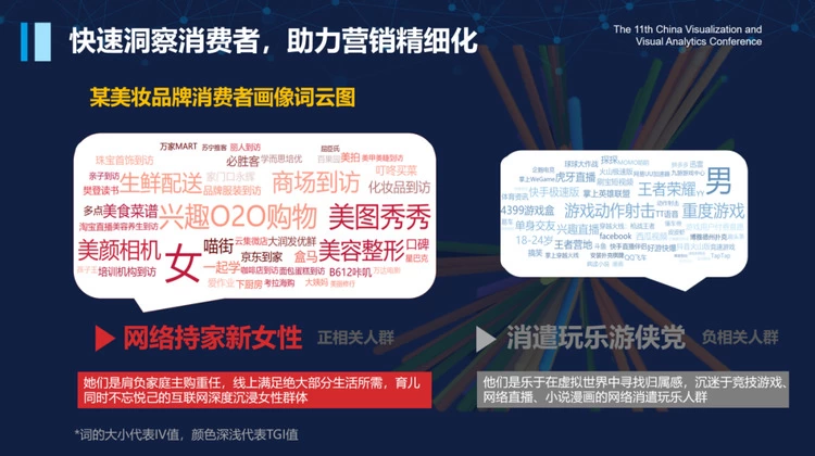 刘宇表示,“为了让客户和业务的同学能够更方便、更直观地看数据和理解数据,读懂数据背后的‘人文含义’,我们往往也通过可视化的方式来呈现数据。比如,为了帮助品牌客户读懂自己的消费者,制定更加科学的营销策略,我们通过可视化特征词云图来清晰、直观地展现用户画像。”