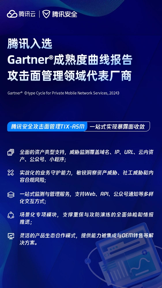 近日,全球IT研究与咨询公司Gartner®发布“Hype Cycle™ for Private Mobile Network Services, 2024”(《2024年专用移动网络服务成熟度曲线》报告),腾讯入选ASM攻击面管理领域“代表厂商”(Sample Vendors)。