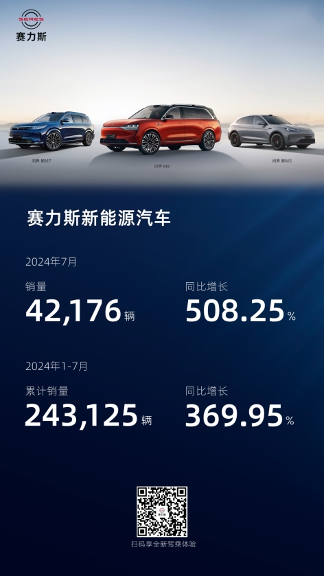 8月1日,赛力斯发布了7月产销快报。数据显示,赛力斯新能源汽车7月销量达42,176辆,同比增长508.25%;今年1-7月累计销量达243,125辆,同比增长369.95%。与此同时,问界凭借28个月实现40万辆新车下线的成绩,一举中国新能源市场成为最快实现40万辆下线的品牌,这一系列成就不仅彰显了赛力斯与华为跨界融合的丰硕成果,也是对双方未来深化合作、共同打造世界级新豪华汽车品牌的坚定承诺。