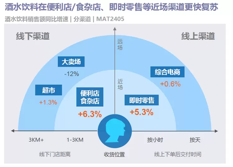 同时,即时零售、便利店等近场渠道为酒水饮料带来增长新机遇。即时零售稳健的增长势头吸引不同品类的品牌和商家争先入局,针对即时零售消费场景进行深度挖掘,激活消费需求,即饮茶、威士忌等多个品类在即时零售渠道实现快速增长。