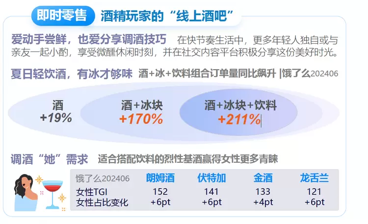 在“追求性价比”与“追求自我愉悦”中不断平衡的消费者们,通过即时零售寻找到了自洽的消费方式,他们将线下饮品店的体验平价“打包”到家,虽用“平替品”满足物质需求,但生活的体验与情感永远独特而美好。例如在核心宅家场景中,DIY打造出了属于自己的“线上酒吧”和“宅家水吧”。以饿了么6月数据为代表,“酒+冰块+饮料”搭配的外卖量同比增长211%,显著高于酒本身订单增幅,“饮料+冰块”的外卖搭配订单量也同比增长。
