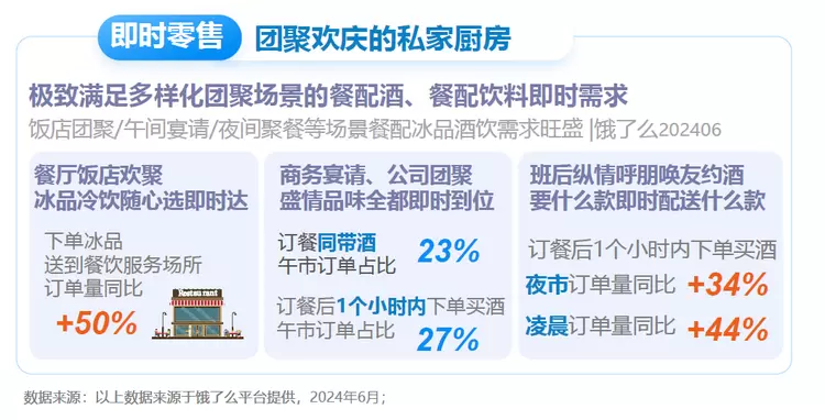 同时,即时零售消费中,细分场景蕴藏的潜力正成为品牌商家不可忽视的新机会。受欧洲杯等热门赛事影响,今夏即时电商平台“餐+零”的消费潜力被打开。欧洲杯期间,除了炒饭、肉夹馍等夜宵外卖显著增长,饿了么凌晨酒水外卖量同比增长超过40%,冰淇淋等冰品同比增长超过50%。同时,今夏饭店团聚、夜间聚餐等日常餐配冰品酒饮需求也较旺盛。其中,送往饭店的冰品外卖量同比增长50%,凌晨时段在1小时内同时点餐和酒的外卖量同比增长44%。