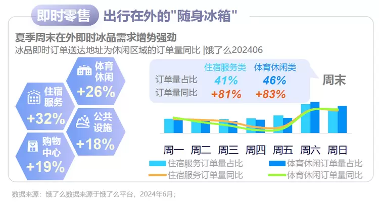 此外,办公和酒店等细分场景的吃冰需求也正高增。报告显示,今年6月,送往写字楼(公司)冰品订单量同比增长约30%,其中深夜加班场景的冰品订单更是同比增长约40%。同时,夏季酒店、体育场馆等出行场景的即时冰品需求增势强劲,周末的冰品订单占比更是超过四成,订单量同比增长均超过80%。