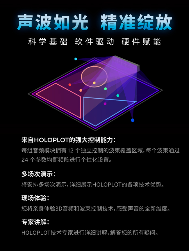 “声波如光,精准掌控”,这不仅是HOLOPLOT技术能力的诠释,更是其实际应用的真实写照。在本次体验活动中,您将亲身感受声音如何被精确地投射到指定区域,打造出完全可控的声场环境。