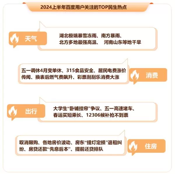 2024上半年,百度用户关注的TOP的民生热点包含了天气、消费、出行、住房等。百度用户心系民生热点,保持着对于社会事件的参与热情,积极参与讨论,抒发自己的见解。