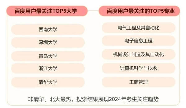 值得注意的是,百度用户最关注的高考信息并不只是学校的名气,院校与专业信息成为用户的重点考虑。《报告》显示,西南大学、深圳大学、青岛大学、浙江大学、清华大学是百度用户最关注的TOP5大学。电气工程及自动化、电子信息工程、机械设计制造及其自动化、计算机科学与技术、工商管理则是百度用户最关注的TOP5专业。