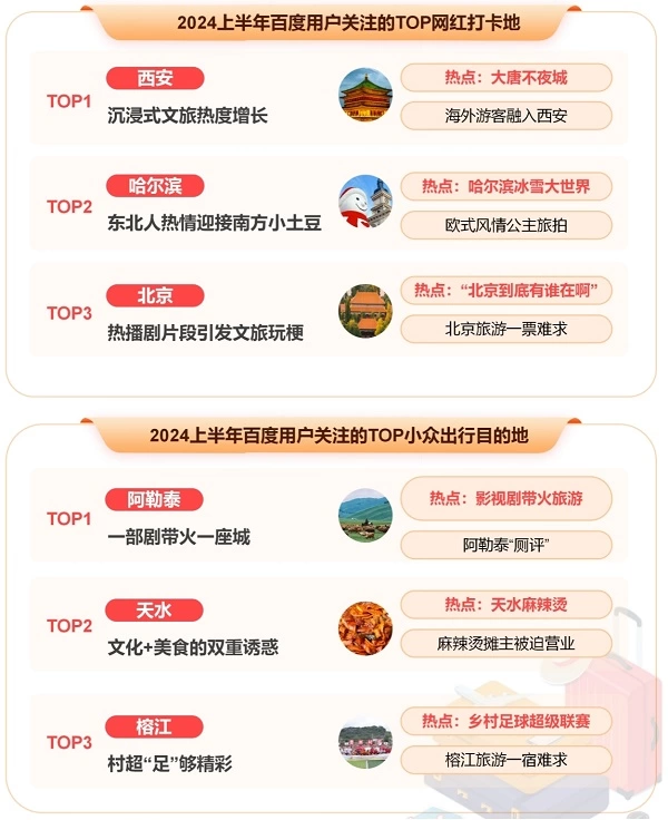 2024上半年,百度用户最关注的TOP3网红出行地分别为西安、哈尔滨、北京,网红打卡地热度不减。此外,天水、阿勒泰、榕江三座城市,因短视频、影视剧获得了“泼天流量”,大量游客涌入小城。为一部剧去一座城的用户,在百度平台获取旅游信息,发声讨论,助力文旅热度提升,使得小众城市也能成为热门目的地。