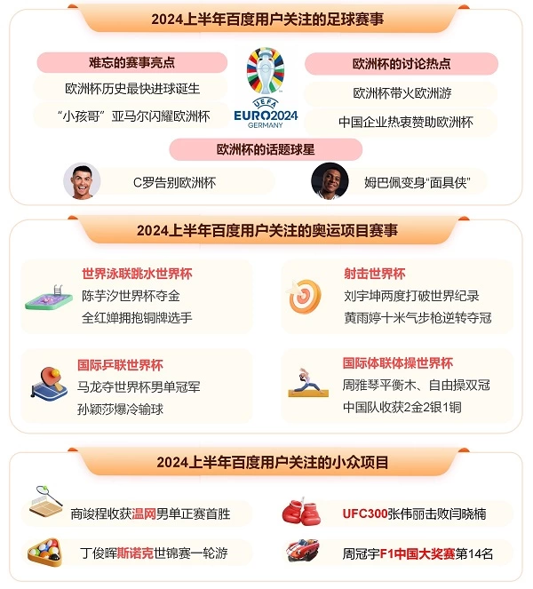 百度体育对于体育赛事的关注是全方位的,除了欧洲杯和奥运这样的重点赛事,2024上半年,温网、UFC300、斯诺克、F1中国大奖赛等相关热搜让用户看到了一系列小众赛事。