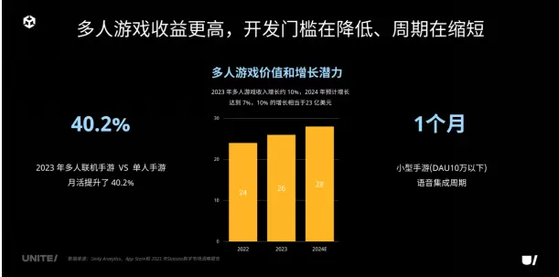 发布现场,声网音频行业负责人杨帆分享了联合 Unity 推出 UOS Hello 产品的初衷。他介绍:“多人联机游戏社交化趋势明显,目前90%的游戏用户倾向于在游戏中与其他玩家互动;并有 52.1% 的游戏用户会通过朋友、玩家推荐新款的游戏;81.9%的游戏用户倾向与其他玩家多人组队合作或者竞技对抗;且多人联机游戏的用户留存和收入相对单机游戏有更大的优势,因此越来越多的开发者会考虑开发多人联机游戏。”