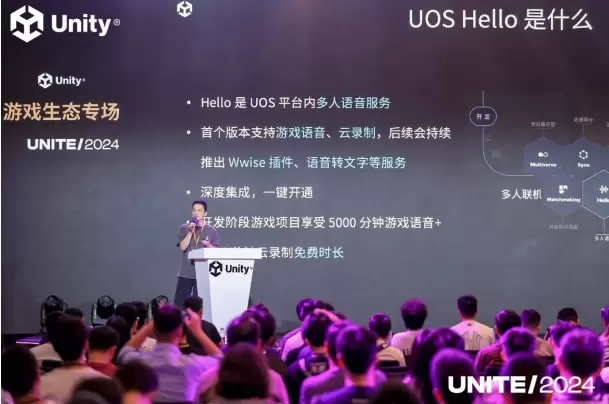 近日,备受瞩目的 Unity 全球开发者大会(Unite Shanghai 2024)在上海圆满落幕。在游戏生态专场上,声网联合 Unity 中国正式对外发布了 UOS Hello 产品,该产品提供游戏内多人语音服务,并支持云录制,为开发者提供一站式、便捷、全球化、低延时、低功耗的游戏语音服务,降低中小型游戏工作室开发联机游戏的门槛。