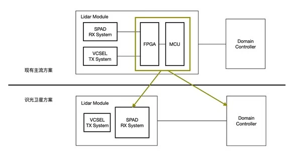 我们将这一方案称为卫星方案,在大幅降低激光雷达整机成本和体积的同时,此方案还具备提高效费比、加速多传感器数据前融合、优化感知算法精确度等优势。