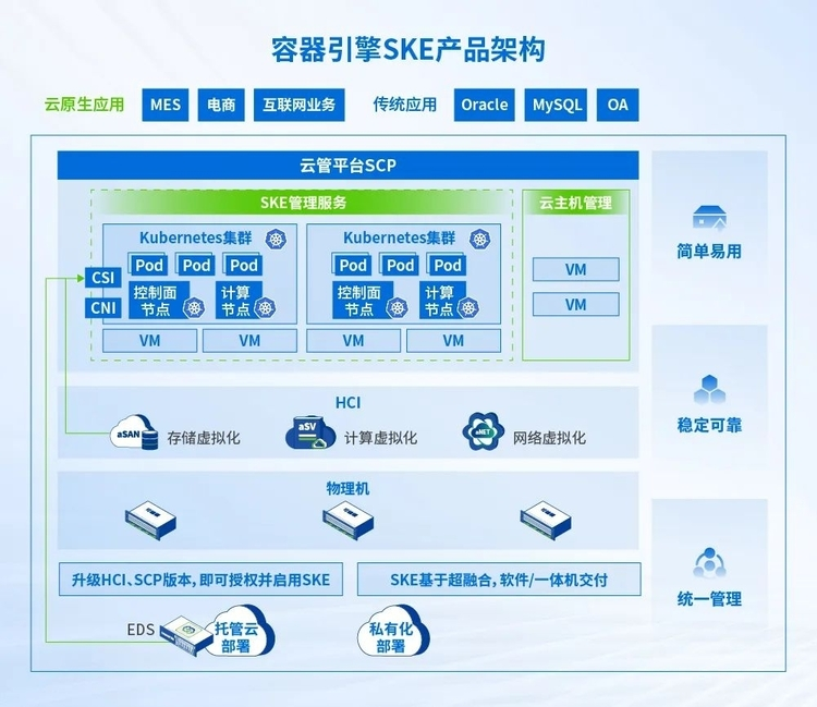 容器引擎SKE与超融合技术深度融合,统一容器和虚拟机的账号权限、监控告警、资源管理等,满足容器和虚拟机混合部署应用的管理需求,显著提升了运维管理效率。