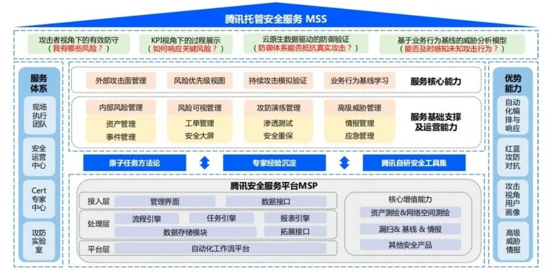 基于腾讯安全服务平台MSP,腾讯安全MSS安全托管服务构建了包含现场执行团队、安全服务中心、CERT专家中心、攻防实验室在内的服务架构体系,帮助企业实现安全建设的提质增效,实现了基于情报、数据、攻防驱动的安全运营体系的落地,具体来说,即: