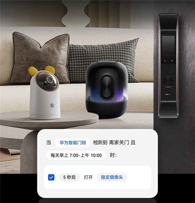 作为旗舰产品,这款摄像头还深度支持鸿蒙智联,可以和任意鸿蒙终端互联,结合摄像头已有的人形侦测、哭声侦测等智慧AI算法,实现全屋智慧联动。比如:摄像头可以与华为门锁互联,当门锁感应到主人离家时,摄像头可自动开启,替你远程看家;摄像头可与鸿蒙智行的车机联动,在车里也能查看家里情况。此外,摄像头还可与支持鸿蒙智联的台灯联动,夜晚摄像头检测到有人经过,则台灯自动开启照明。
