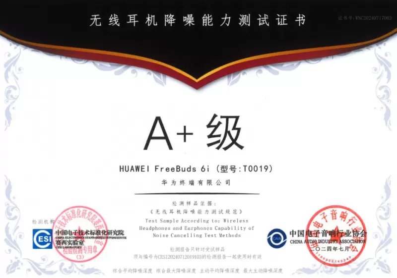 华为FreeBuds 6i支持27dB全频段平均降噪深度和最高5kHz主动降噪频宽,综合降噪性能相比上代提升了100%。凭借强大的降噪性能,华为FreeBuds 6i获得了中国电子音响协会A+级的降噪能力专业认证,让用户无惧噪音袭扰,随享安静舒心。相较于行业内宣传的仅单一频率点降噪深度很深的耳机,全频段平均降噪能力强的耳机能够更均衡、全面地覆盖生活中各种复杂的噪声环境。华为FreeBuds 6i由单频出色到全频出彩。
