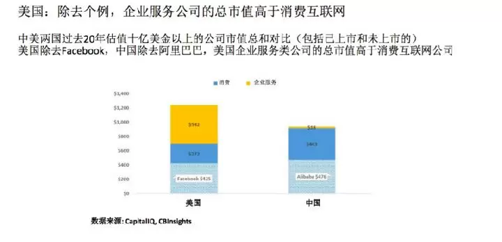 过去十年,虽然中国的VC在企业服务市场赚到的钱没有在消费互联网上多,但美国企业服务公司的总市值已经超过消费互联网。其实,美国消费互联网方面,已经出现了诸如Facebook、Twitter这样体量的大公司,但美国企业服务类公司的总市值仍超过消费互联网。