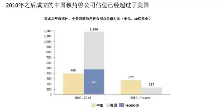 这里面有一个是不太公平的地方。即使将Facebook这样的特例剔除,中国公司估值还是低于美国公司的。但是最近几年,新成立的公司中,中国的独角兽数量远远超过美国,估值可能稍微有点差距,但是数量上来说要远远超过美国。