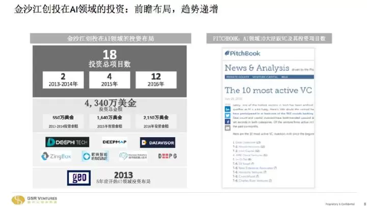 2016年,金沙江投了12个AI相关的项目,去年投了几个,加在一起过去三四年投了二十几个AI项目,包括深鉴科技、DeepMap、DataAdvisor、Zingbox、聚熵智能、地平线等。这些项目差不多一半在国内,一半在硅谷,总体来说硅谷还是相对来说人才实力更强一点。