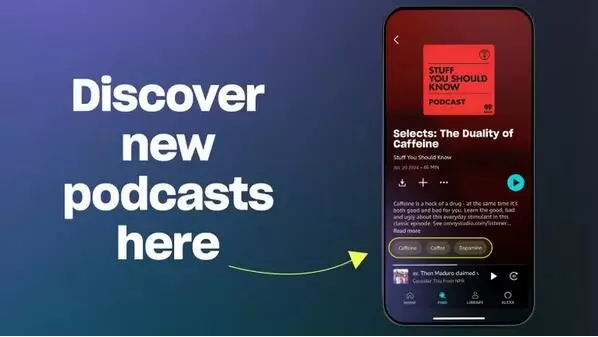 亚马逊分享了一张亚马逊音乐移动应用程序的屏幕截图,该截图来自“你应该知道的东西”播客中关于咖啡因作为药物的影响的一集。标题为“精选:咖啡因的双重性”,亚马逊在产品描述下方添加了三个“主题”标签:“咖啡因”、“咖啡”和“多巴胺”。