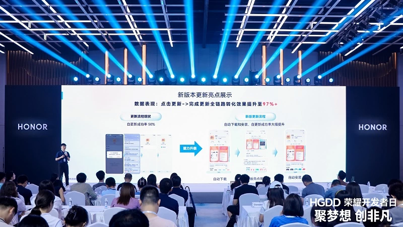 针对上架分发环节,荣耀应用市场展示了新版本推出的自更新产品功能,用户无需自主更新,新版本发布后可自动下载和安装应用,确保用户始终使用最新版本的应用APP,降低旧版本安全漏洞带来的使用风险。据介绍,自更新功能的推出,使应用更新全链路转化效果从50%提升至97%,显著提升用户满意度和留存率,进一步提升更新效率;客观的应用评分和商店排名也是提升用户体验、实现运营增长的重要关注指标,荣耀应用市场创新提供“评论一键直达”功能,可有效降低用户发布评论的时间、精力成本,从而帮助开发者更快获取用户的真实反馈,助力应用踏上流量新速率。