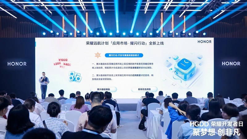 此外,为进一步繁荣应用生态,荣耀应用市场还向开发者推出了新的激励活动——“耀闪行动”,已在荣耀应用市场上架应用的开发者可邀请未上架应用的伙伴加入荣耀应用市场,共享高价值的激励资源,实现商业变现及互利共赢。