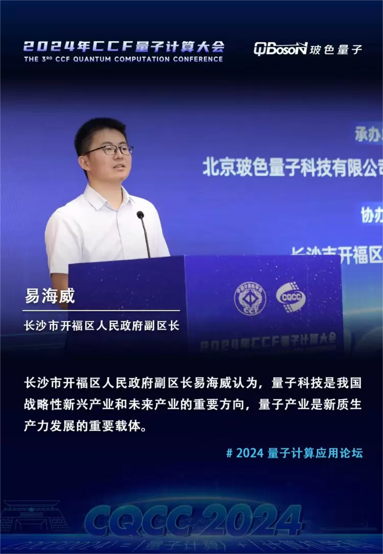 长沙市开福区人民政府副区长易海威在致辞中提到,量子科技是我国战略性新兴产业和未来产业的重要方向,量子产业是新质生产力发展的重要载体,开福区承载国防科大等众多驻区高校院所,在量子科技方向的储备稳居全省前列。
