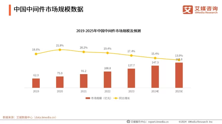 iiMedia Research(艾媒咨询)数据显示,2023年中国中间件市场规模为127.7亿元,同比增长17.4%,2025年将达167.8亿元。随着国产中间件厂商技术的升级,国产中间件头部厂商逐渐赶超国外厂商,在电信、金融、政府、军工、能源、医疗等行业客户中不断打破原有海外中间件厂商的垄断,逐步实现中间件软件产品的国产化自主可控。