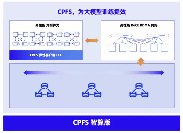 随着大模型参数和数据集规模的迅速增长,包含更多数据量的多模态大模型也成为趋势,大模型训练对存储的要求更高,需要更快的数据读写、传输和更大的存储空间。阿里云CPFS是专为AI和高性能计算而设计的存储产品。CPFS通过创新的分布式并行存储架构设计,自研的高性能RoCE RDMA网络协议和虚拟存储通道技术,多级缓存的弹性客户端,最终实现高吞吐、低延迟、Serverless化的高性能存储能力。