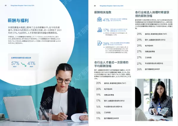 尽管只有21%的受访者表示正在积极寻找新工作,但这比2023年增加了3%。积极求职者数量的增加似乎与被动求职者数量减少3%之间存在相关性。求职行为最积极的受访者来自消费品和零售行业(30%)。2024年的调查显示,对薪酬福利不满意是促使人才更换工作的主要原因之一(从2023年的第三位上升至2024年的第一位)。80%的受访者将薪酬福利问题列为首要原因,紧随其后的是缺少升职空间(62%)和行业发展没有前景(51%)。63%的受访者对目前的薪酬福利表示满意或非常满意,而28%的求职者在跳槽时期望的加薪幅度为大多数。