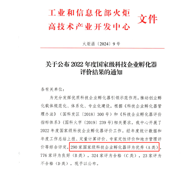 近日,工信部火炬中心发布了《关于公布2022年度国家级科技企业孵化器评价结果的通知》。经年度统计数据和年度工作总结上报、定量计算评价、专家定性评价和地方管理评价等综合评定,290家国家级科技企业孵化器评为优秀(A类),776 家评为良好(B类),324 家评为合格(C类),23 家评为不合格(D类)。