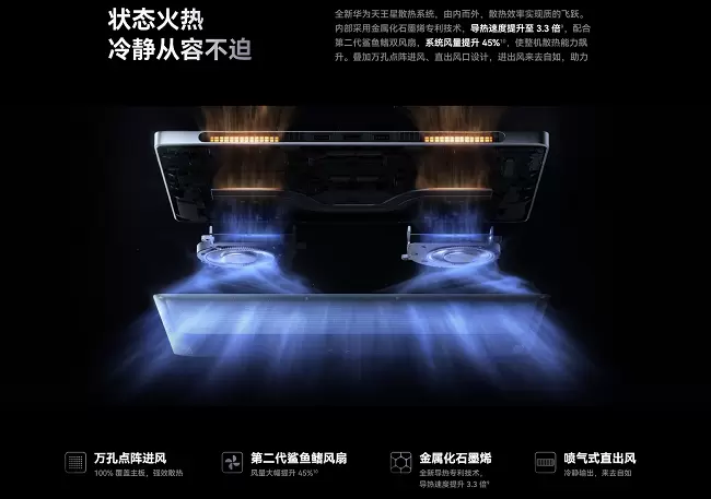 散热方面,华为天王星散热系统在业界首创金属化石墨烯散热模组,配备第二代鲨鱼鳍风扇,通过万孔点阵进风,完美压制笔记本在高强度运行下的热量,先锋设计,强得一眼高能,长久高频使用也能保证系统稳定如初。