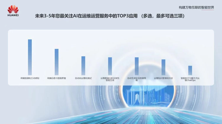 在 “人工智能在行业智能化运维运营中的价值场景”的研讨环节,华为中国政企CMO邱恒组织与会嘉宾围绕AI在智能化运维运营中的7个价值场景(故障预测和主动感知、故障自愈与智能修复、自动化运维和测试、智能助手与聊天式运维ChatOps、运维知识管理和沉淀、自动生成安全防御策略、运维数据分析及报告智能生成)展开了热烈讨论,并投票选出了“未来3-5年最值得关注的AI在运维运营服务中的TOP 3应用”:故障预测和主动感知、故障自愈与智能修复、以及自动化运维和测试。这些应用能显著提升企业运维效率,降低运维成本,为企业的数智化转型提供有力保障。