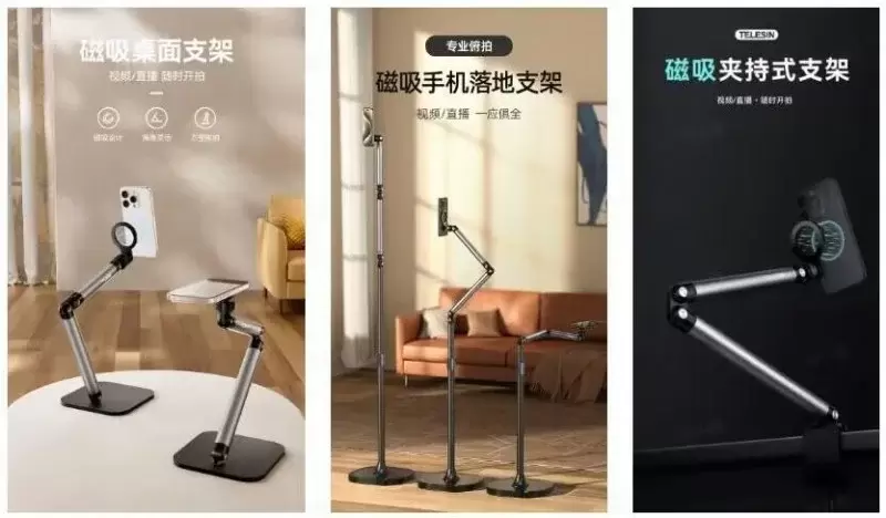 直播支架系列(桌面款、落地款、夹持款):采用超前强力磁吸环设计,实现秒放秒吸,单手即可轻松操作。搭配360°阻尼转轴,支持直拍、侧拍、俯拍、仰拍等多种角度拍摄,满足直播与创作的多样化需求。