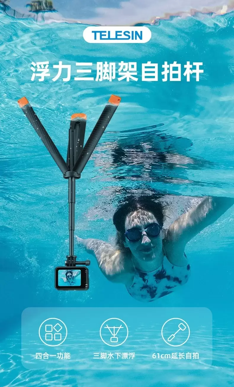 浮力三脚架自拍杆:集浮力棒、防水伸缩自拍杆、三脚架、手柄四大功能于一体,独特的三脚独立设计,即使在水下也能实现无需手持的稳定拍摄,确保画面清晰流畅。