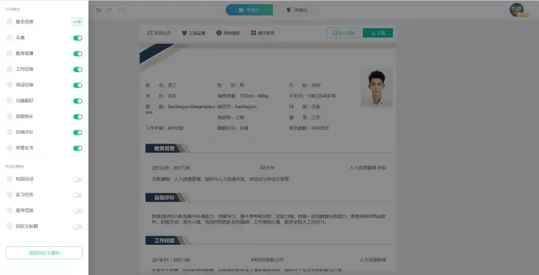 选好模板之后,了了简历支持线上编辑,并且编辑很便捷。它可以管理模块,就可以一键隐藏一些你不需要的模块,或者一键添加。