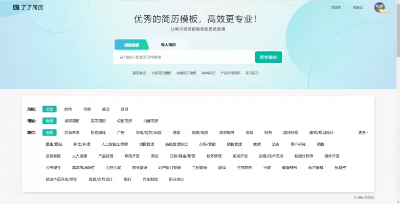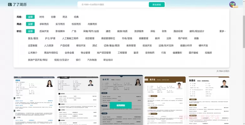 这里给大家推荐一个神器——了了简历,这个网站上的模板十分多,并且分了不同的场景、工作等等。