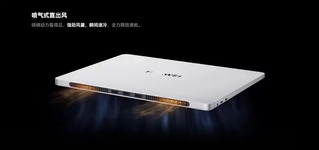 其中,让人过目难忘的喷气式直出风设计,创新地将金属机身、3D立体超材料天线与后直出风结合在一起,带来了犹如宇宙飞船一般的醒目设计。同时,喷气式直出风设计通过对笔记本风道进行改良,带来了更好的出风效率,更薄机身与更强出风一机兼得。