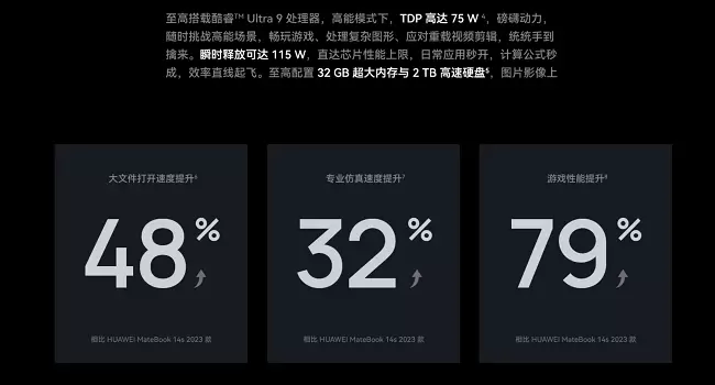 (1)、搭载Ultra 9、Ultra 7的型号可达到的瞬时最大性能功耗为115W,搭载Ultra 5的型号为100W。数据来源于华为实验室,实际性能依环境、测量方法不同有所差异,请以实际体验为准。