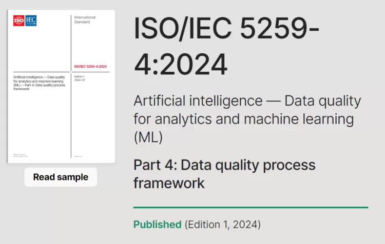 2024年7月,由科大讯飞主导,联合中国电子技术标准化研究院共同提出的国际标准 ISO/IEC 5259-4:2024《人工智能-分析和机器学习的数据质量-第4部分:数据质量过程框架》(Artificial intelligence - Data quality for analytics and machine learning (ML)- Part 4: Data quality process framework)正式发布。该标准也成为首个由中国牵头的人工智能领域数据质量国际标准,标志着中国在全球AI领域数据标准化进程中迈出了坚实的一步。