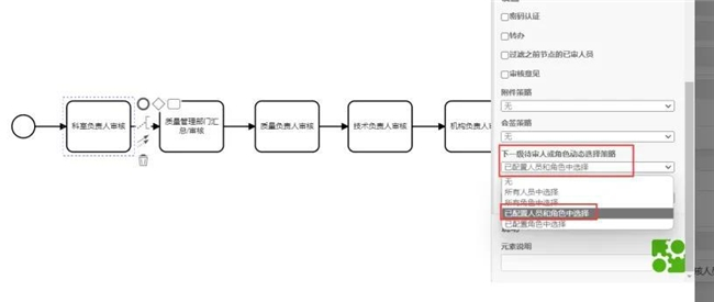 用户可根据组织架构、审批程序的调整和变动,自定义在系统页面对密码认证、过滤之前节点的已审人员、审核意见、附件策略、会签策略、下一级待审人或角色动态选择策略、已配置人员和角色中选择、审核人过滤策略、人员和审批角色的分配。