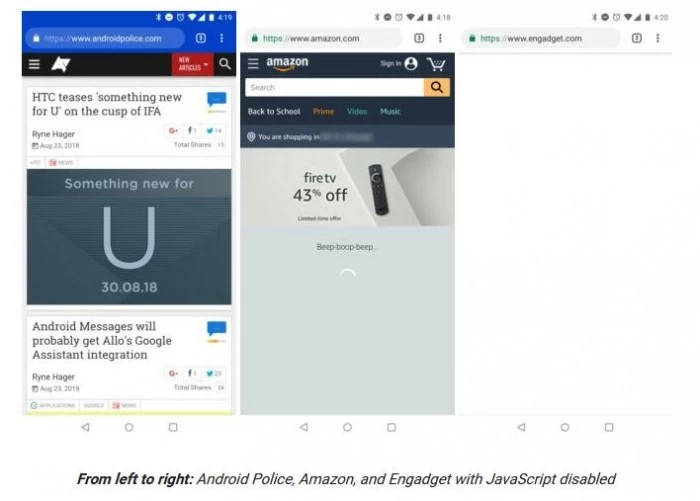 很多页面的交互都是基于JavaScript的,在禁用JavaScript之后虽然部分网站依然保持基础功能,但事实上很多网站并不会产生太大的影响。下图从左至右分别是关闭JavaScript后访问Android Police, Amazon和Engadget网站。