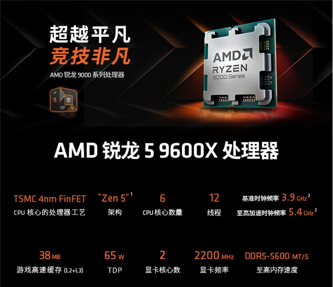 作为AMD首发主打型号之一的锐龙5 9600X最受广大粉丝关注,首发不到2000元的价格非常适合广大普通玩家。6核12线程最高睿频5.4Ghz、L2+L3共计38MB的大缓存足以满足目前主流3A与电竞游戏的需求。