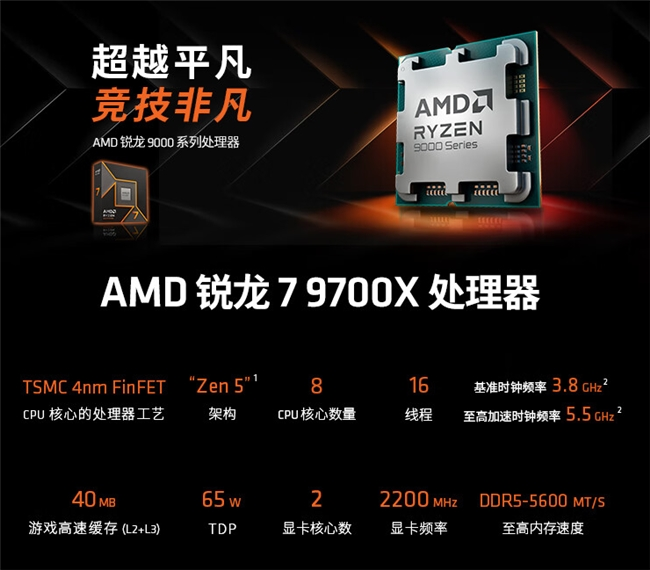 锐龙 7 9700X:8 月 8 日发售,8 核 16 线程,最高 5.5 GHz,65W,售价 359 美元(京东建议零售价:2549元)