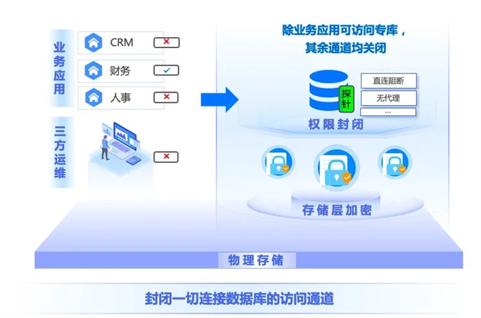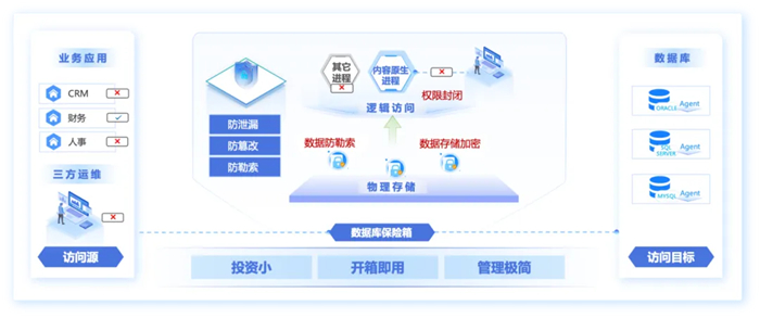 数据库保险箱基于零信任理念,将防护场景精准收敛至业务专库的存储域数据安全,通过防泄漏、防篡改、防勒索一站式安全能力,帮助中小企事业用户“多快好省”的达成数据安全全面主动防护,确保只有原生业务才能访问数据库,真正实现业务数据的专库专用。