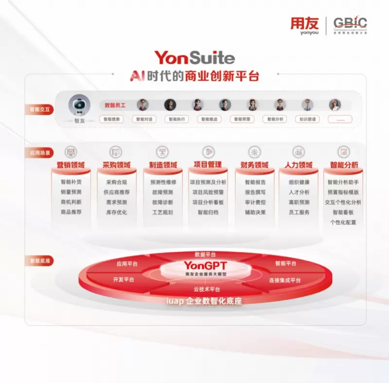 在应用场景层,AI能力赋予企业各业务场景的智能化,包含营销领域、财务领域、制造领域、项目管理、采购领域、人力领域等,形成AI+全场景,助力YonSuite成为AI时代的商业创新平台。