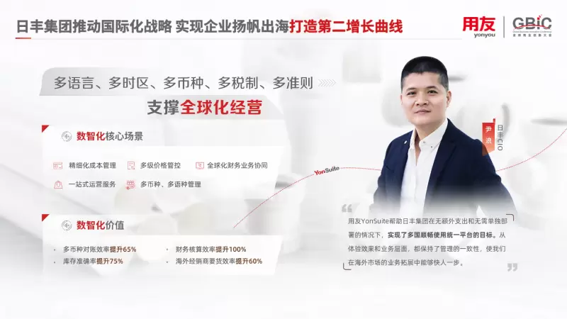 以日丰公司的全球化出海为例,YonSuite为日丰集团提供了多币种、多语种管理的能力,支持企业在无额外支出和无需单独部署的情况下,实现多国使用统一平台的目标。这保证了管理的一致性,实现财务核算效率提升100%,海外经销商要货效率提升60%,在海外市场拓展中提供了速度优势,扬帆出海打造第二增长曲线。